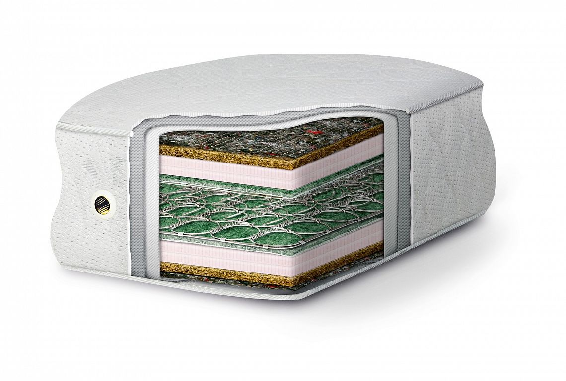 Sprężyny bonellowe, z wysokogatunkowego drutu 2,4 mm, H- 11 cm, Wkład sprężynowy w materacu jednostronnym obłożony jest z jednej strony siatką tapicerską i 30 mm płytą kokosu, a z drugiej warstwą przekładki tapicerskiej i pianką poliuretanową T-30 o zwiększonej sprężystości. Dwustronny obłożony jest siatką tapicerską i 30 mm płytą kokosu.