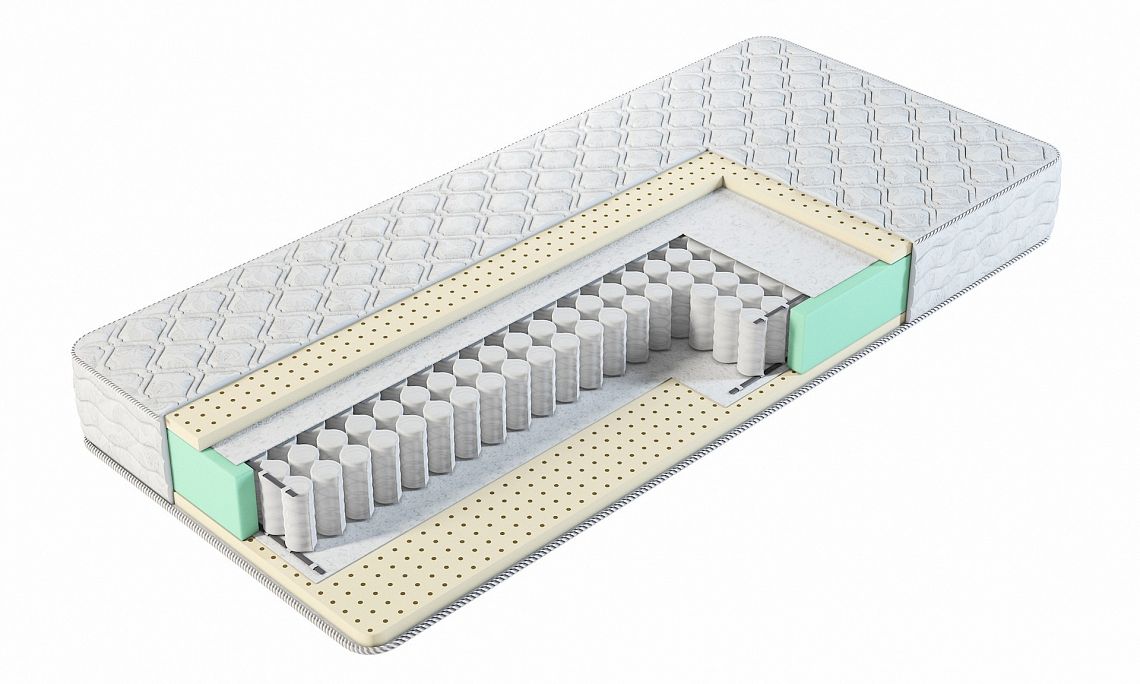 Materac DE LUX ze sprężyn kieszonkowych, z wysokogatunkowego drutu, obłożony obustronnie odpowiednią siatką tapicerską oraz z jednej strony warstwą pianki memory 35 mm, a z drugiej strony warstwą lateksu 35 mm.