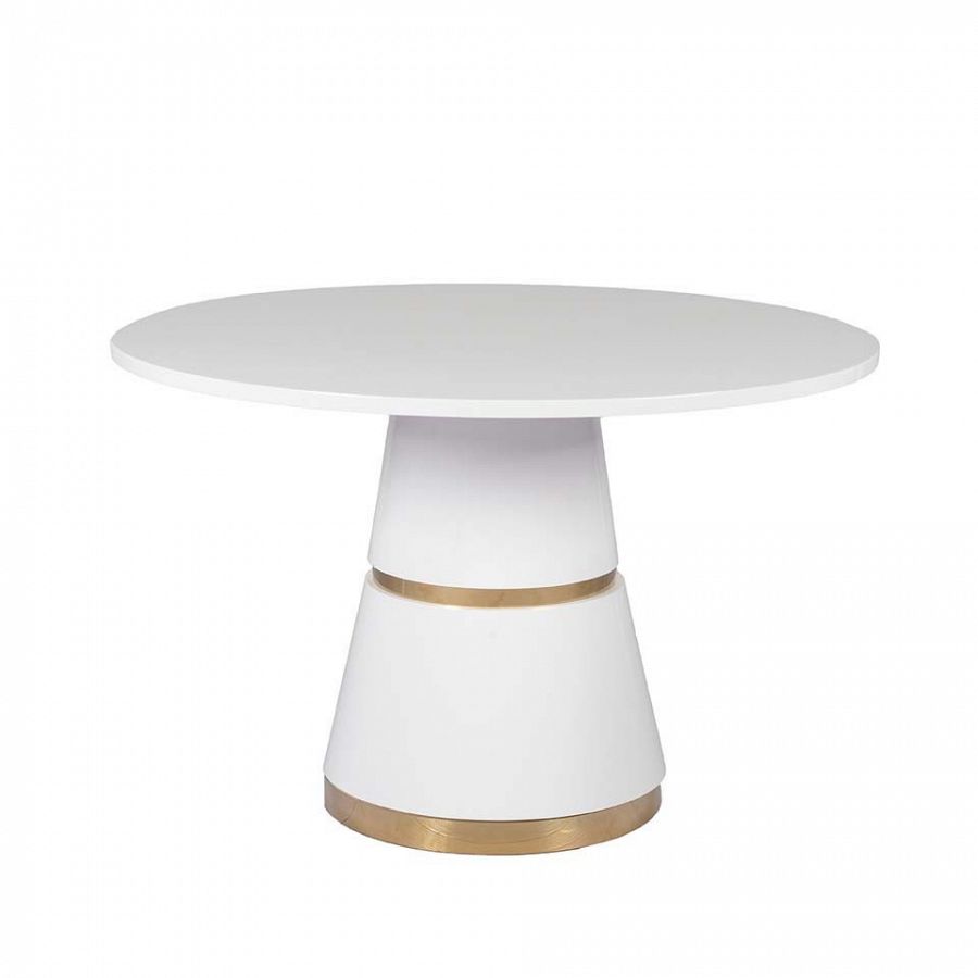 Mentona to elegancki, klasyczny stół z okrągłym blatem, który sprawdzi się w każdej jadalni. Blat osadzony jest na metalowej podstawie w kolorze złotym, łączącej go z masywną nogą. Stół jest w kolorze białym lub czarnym.